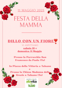 Presso la Parrocchia San Francesco da Paola a Taranto e in Piazza della Vittoria e presso la Chiesa Madonna delle Grazie a Talsano saranno allestiti banchetti per la vendita di rose rosse da regalare alle mamme insieme ad una pergamena con una frase di auguri.