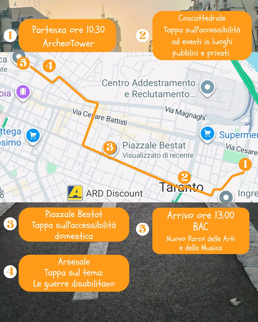 - la mattina di sabato 4 ottobre, il Mobility Pride; ovvero triride, sedie a rotelle elettriche, biciclette classiche o, a pedalata assistita, monopattini, skates, jolette, percorreranno le strade dal raduno delle ore 10 presso Archeotower (Parco delle mura greche), fino all’arrivo (ore 12) al Parco della Musica passando per la Concattedrale, piazzale Bestat, la pista ciclabile di via Dante, via Polibio fino al Muraglione infine l’arsenale e all’arrivo al Parco della Musica. Un corteo di 2,5 Km per sperimentare la mobilità possibile nella città dei due mari, con brevi soste alla Concattedrale, al piazzale Bestat e davanti l’Arsenale. Ogni sosta sarà l’occasione per approfondire una tematica, ad esempio, la guerra e la disabilitazione fisica e mentale causata dalla sua violenza. Non a caso nel corteo le bandiere per la pace e per la Palestina sventoleranno insieme alla Disability Flag.