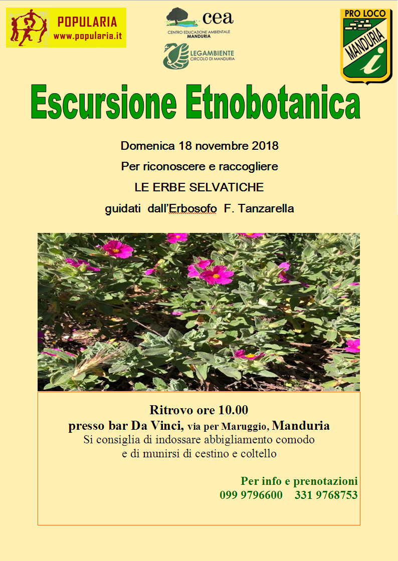 Il CEA (Centro Educazione Ambientale) di Manduria, in collaborazione con Pro Loco e Popularia Onlus organizzano una escursione etnobotanica guidata didattica per domenica 18 novembre sotto la guida attenta dell’esperto Felice Tanzarella.