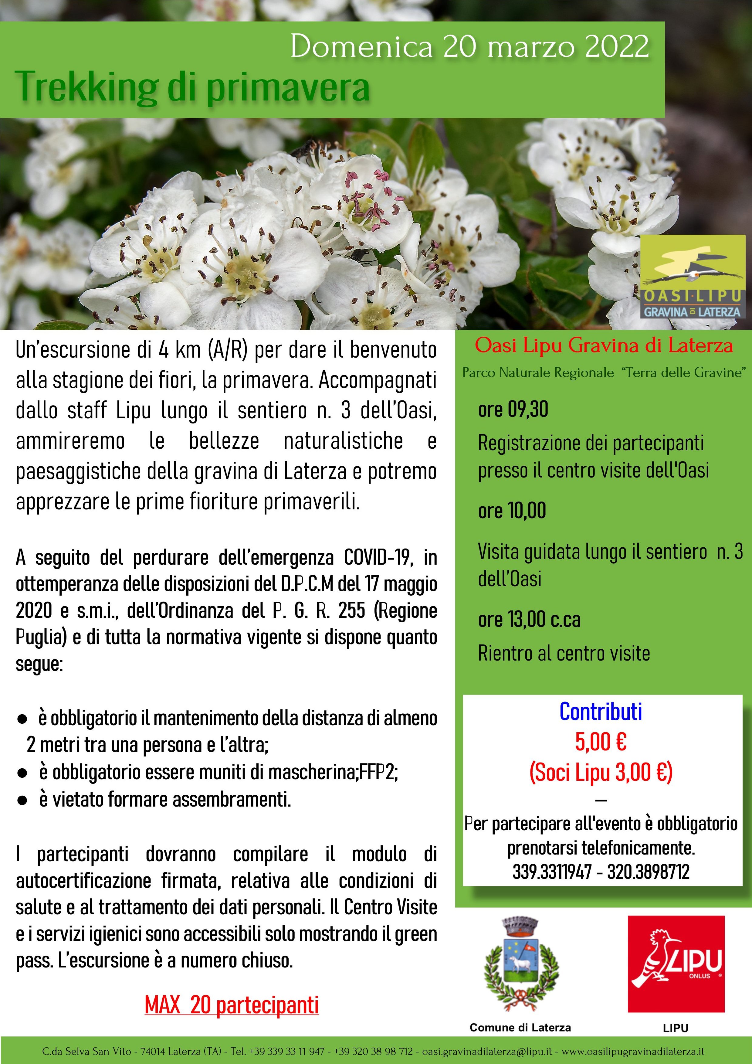 Nell’ambito del programma Eventi-Natura 2022 dell’Oasi LIPU Gravina di Laterza – realizzato grazie al contributo del Comune di Laterza, domenica 20 marzo alle ore 9.30, si terrà l’evento Trekking di primavera.