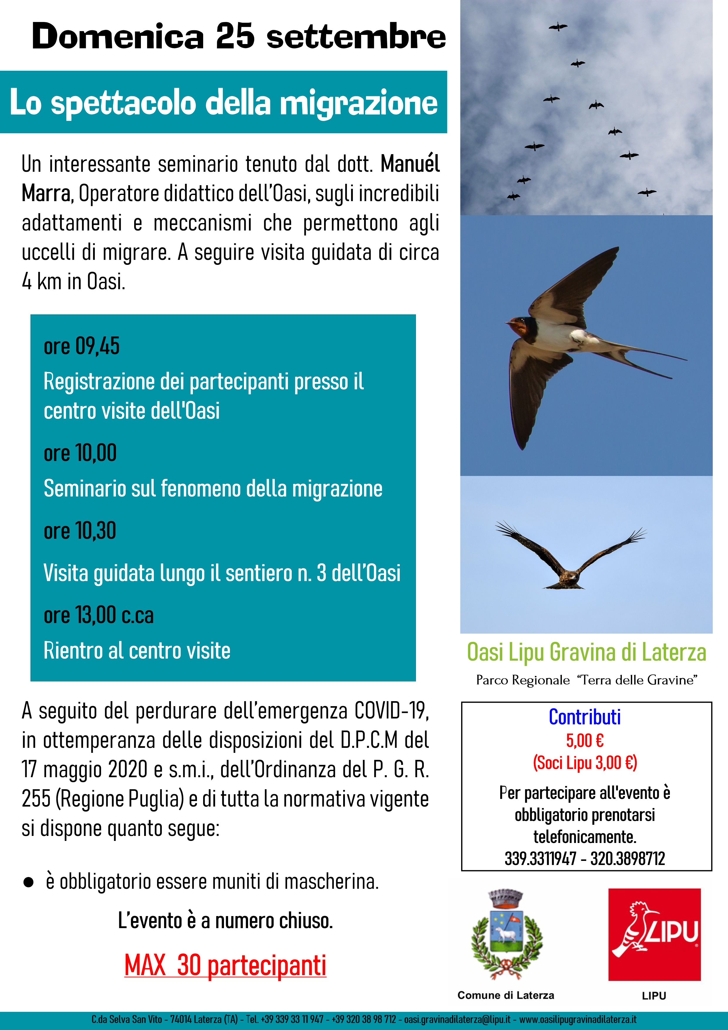 Nell’ambito del programma Eventi-Natura 2022 dell’Oasi Lipu Gravina di Laterza – realizzato grazie al contributo del Comune di Laterza, domenica 25 settembre, alle ore 09.45, si terrà l’evento Lo spettacolo della migrazione.