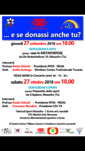 Il secondo appuntamento è previsto per il 27 ottobre sempre alle ore 18:00 con l’evento Donazione e Sportcon la collaborazione di alcune associazioni sportive. In questa occasione la Presidente della FIDAS Massafra, Sig.ra Orlandi parlerà di che cosa è la donazione e che cosa è fidas e come opera.