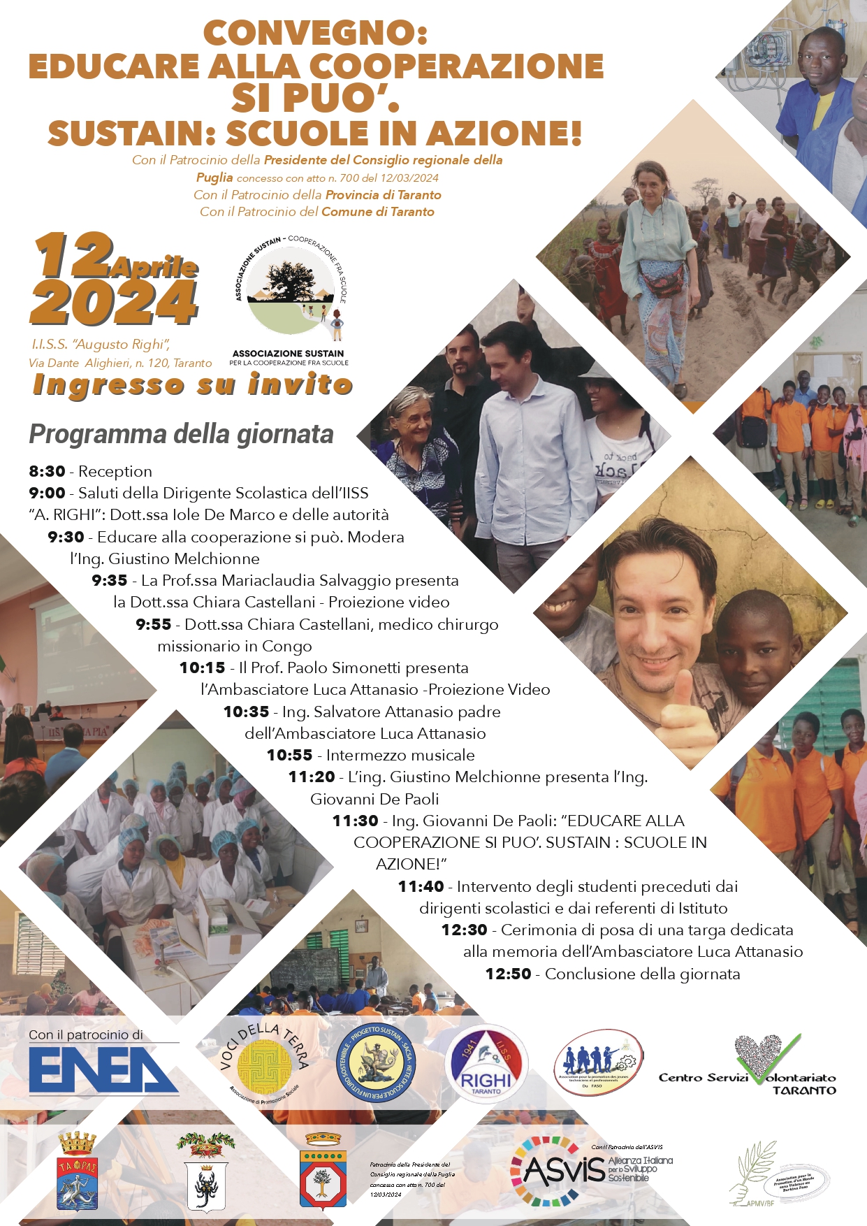 Il convegno di Taranto si avvale del Patrocinio della Presidente del Consiglio regionale della Puglia concesso con atto n. 700 del 12/03/2024, della Provincia di Taranto, del Csv Taranto ETS e del Comune di Taranto, dell’ENEA e dell’ASviS, Alleanza Italiana per lo sviluppo sostenibile.’, dell’ ETS- APS Voci della Terra, e delle associazioni, partner dell’Associazione SUSTAIN, burkinabè L’association Pour La Promotion D’un Monde Sans Violence/Au Burkina Faso con sede a Fada N’Gourma, e L’association Sustain pour La Coopération Entre Écoles con sede a Ouagadougou.