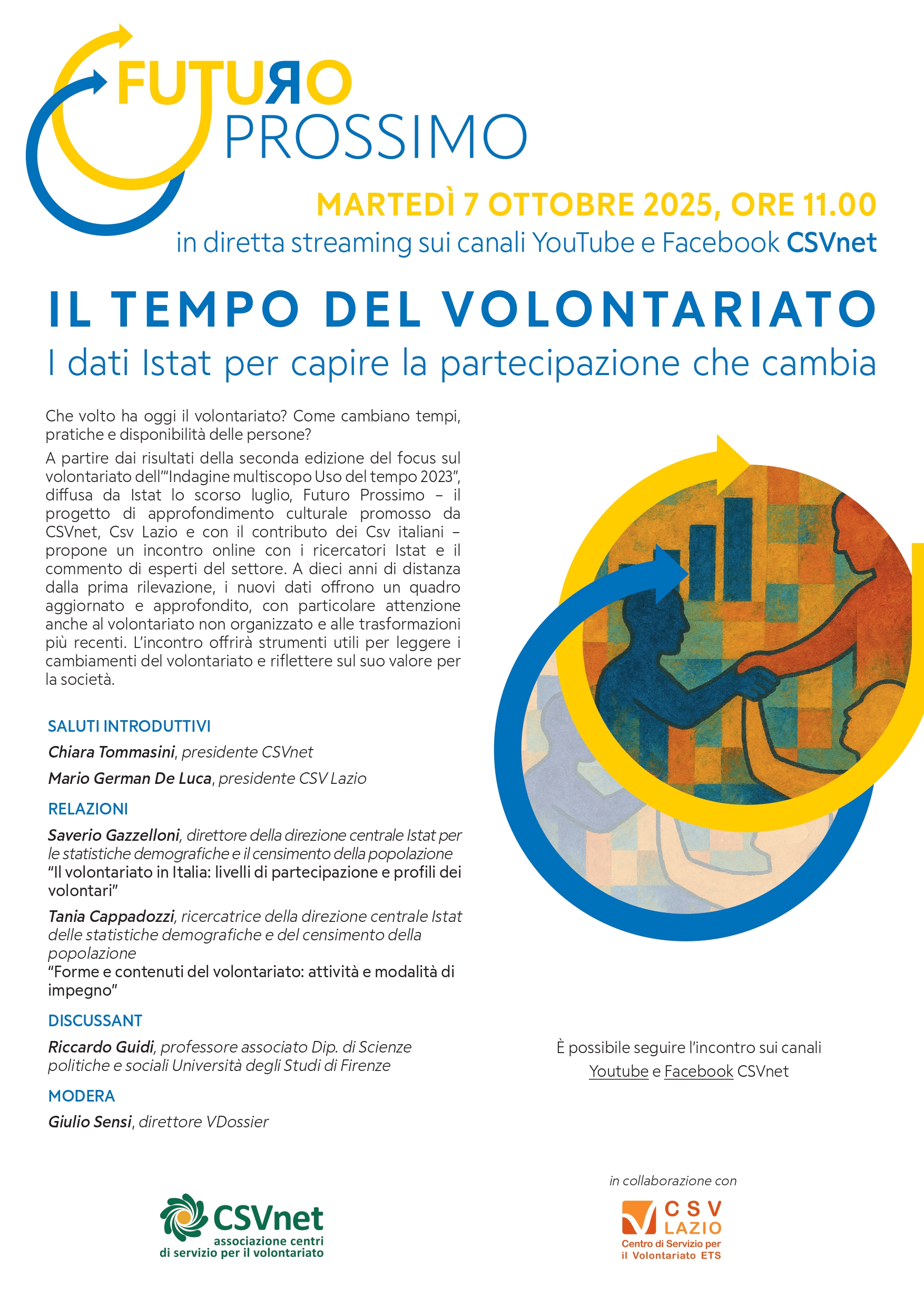 Martedì 7 ottobre alle 11:00 si terrà in diretta streaming, sui canali YouTube e Facebook di CSVnet, l’evento “Il tempo del volontariato. I dati Istat per capire la partecipazione che