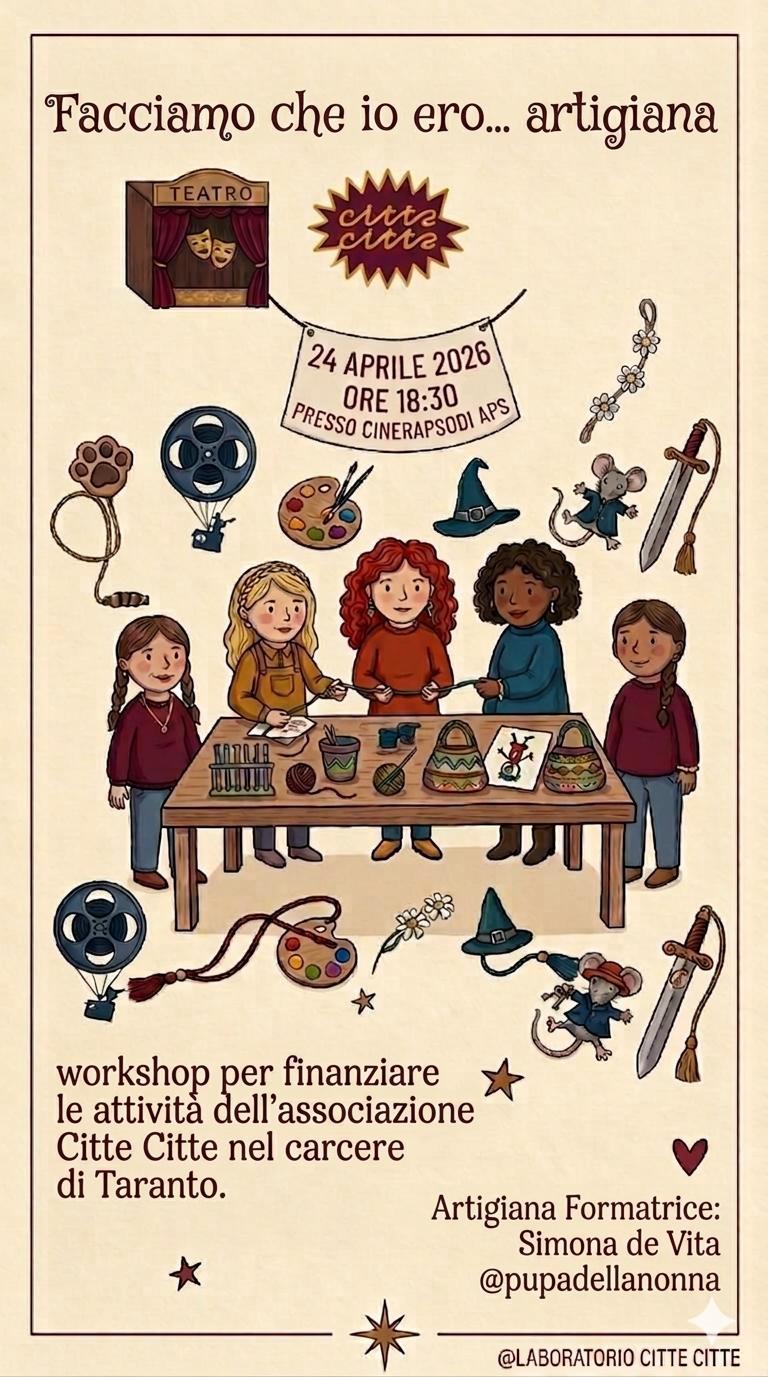 Si chiama Facciamo che io ero… artigiana il workshop all’insegna della creatività e della solidarietà che si terrà venerdì 24 aprile presso CINerapsodi APS in via Niceforo Foca 20 a Taranto alle ore 18:30.