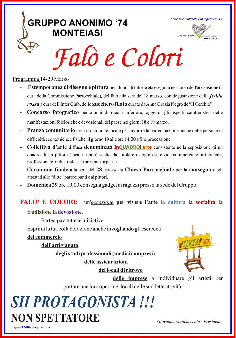 Si terrà il 18 marzo p.v. ed è la più longeva delle manifestazioni del Gruppo Anonimo ’74 dal titolo Falò e colori, organizzata con il patrocinio del CSV Taranto.