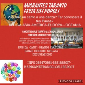 Torna domenica 6 maggio p.v. alle 16:00 la Festa dei Popoli, l’iniziativa organizzata da Migrantes, che rappresenta un momento molto importante per la città in tema di integrazione, multietnicità e intercultura. Di sicuro rappresenta un fattore di coinvolgimento e di attrazione per l’intera cittadinanza nonché un’ottima occasione per attutire eventuali tensioni sociali.