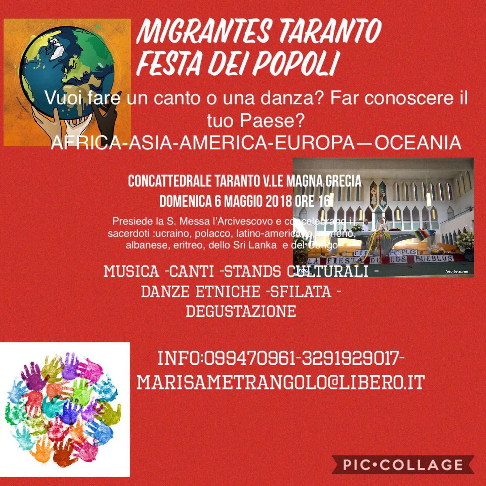 Alle 16,30 presso la Concattedrale di Taranto si svolgerà la Celebrazione Eucaristica presieduta da S.E.R. Arcivescovo Mons. Filippo Santoro, concelebreranno i sacerdoti delle comunità: polacca, albanese, rumena, ucraina,latino-americana, del Congo e dello Sri Lanka.