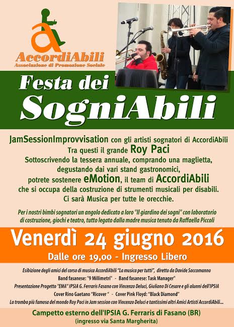one “Accordiabili” ha organizzato per il prossimo 24 giugno la Festa dei Sogni Abili. L’evento, ad ingresso libero (dal cancello in via Santa Margherita), avrà luogo presso il campetto esterno dell’Ipsia “G.Ferraris” di Fasano, grazie alla diponibilità e alla sensibilità della dirigente dell’istituto Rita De Vito.