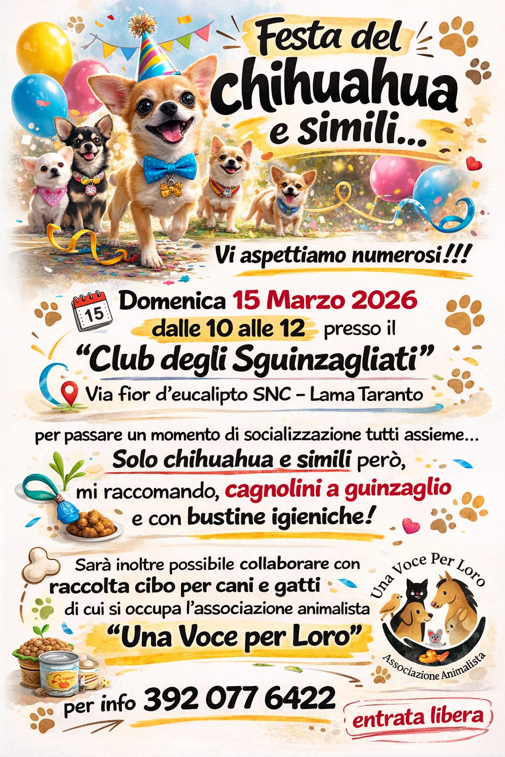 E’ organizzata dall’Associazione Una Voce per Loro APS l’iniziativa Festa del Chihuahua che si terrà domenica 15 marzo dalle 10:00 alle 12:00 presso il “Club degli Sguinzagliati” in Via Fior d’Eucalipto SNC a Lama.