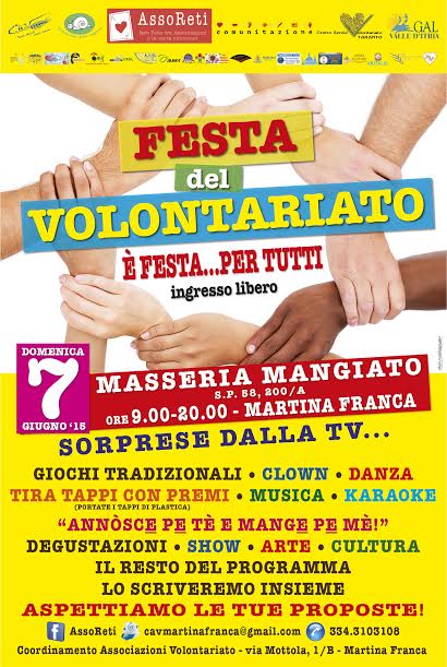 Domenica 7 giugno p.v. a Martina Franca si terrà la 1^ Festa del Volontariato promossa dal Coordinamento delle Associazioni di Volontariato – CAV Martina Franca a conclusione dell’articolato percorso realizzato nei mesi scorsi dalle associazioni del territorio con l’iniziativa ASSORETI ammessa all’Invito 2014 Proposte in collaborazione con il C.S.V.