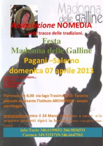Domenica 7 aprile p.v. l’Associazione Nomedia organizza una gita in un grazioso paesino in provincia di Salerno, Pagani, dove ogni anno la prima domenica dopo Pasqua si svolge una curiosa festa religiosa dal nome insolito, Festa della Madonna delle Galline.