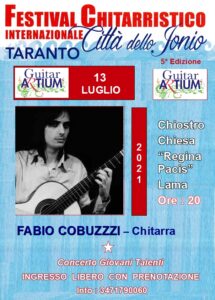 A concludere la serata, il concerto del giovane chitarrista Fabio Cobuzzi. Nato a Foggia nel 1993, inizia lo studio della chitarra classica con il M° Sepalone e si diploma con il massimo dei voti presso il conservatorio G. Tartini di Trieste sotto la guida del M° Torlontano. Frequenta nel 2012 e nel 2014 il Festival Internazionale “Duchi d’Acquaviva” e si perfeziona con il M° D’Amario. Vincitore di primi premi assoluti a concorsi internazionali: ”Sarro musica di Trani” (BAT), ”Alirio Diaz” di Taranto, ”Città di Barletta” (BAT), ”Don Matteo Colucci” di Torre Canne (BR), ”Eratai” di San Giovanni Rotondo (FG) ed ”Igor Strawinskj” di Valenzana (BA). Il programma prevede l’esecuzione dei grandi classici della chitarra.