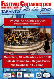 Si terrà mercoledì 10 settembre alle ore 19.30 presso la Sala di Comunità della Chiesa Regina Pacis in Via Sciabelle 14 a Lama, il concerto dell’Orchestra “Andrés Segovia” diretta dalla Prof.ssa Maria Ivana Oliva nell’ambito del Festival Chitarristico Internazionale “Città dello Jonio”.