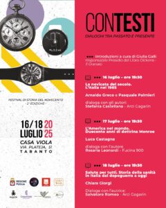 Ritorna a Taranto il Festival di storia del Novecento “ConTesti. Dialoghi tra passato e presente” che, giunto alla seconda edizione, è promosso da Arci Gagarin APS, in collaborazione con il Presidio del Libro “Dickens-Il Granaio” e le Associazioni Fucina900 e Mangrovie, con il sostegno della Regione Puglia e il patrocinio morale del CSV Taranto ETS.