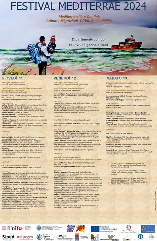Concepito nell’ambito del progetto M.E.D.I.A.T.I.O.N. (Horizon Europe Seeds), coordinato dalla prof.ssa Adriana Schiedi, il Festival si pone a chiusura di un prezioso calendario di riflessioni, iniziative e incontri incentrati sulla necessità di elaborare un modello di integrazione socio-economica e culturale dei migranti del Mediterraneo.