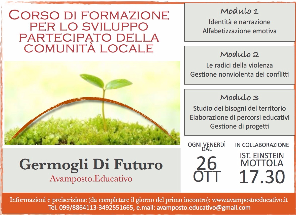 L’Associazione Avamposto Educativo propone Germogli di futuro, un corso di formazione per favorire lo sviluppo partecipato della comunità locale, con la cura del capitale umano rappresentato dalle tante risorse che hanno reso i progetti dell’associazione concreti ed efficaci. Il corso si propone di trasferire gli strumenti educativi utili alla conduzione della realtà associativa, attraverso tre moduli orientati ad approfondire gli aspetti motivazionali e di elaborazione e gestione dei progetti di impegno sociale.