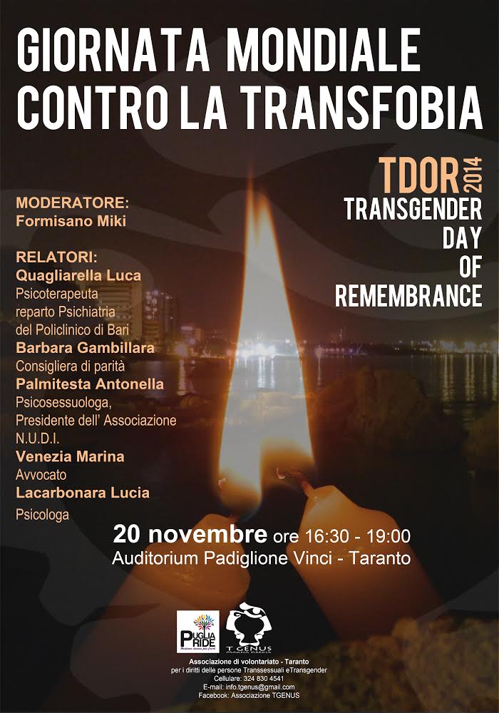 Si terrà giovedì 20 novembre p.v. dalle ore 16:30 alle ore 19:00 presso l’Auditorium del Padiglione Vinci il Transgender Day of Remembrance o TDoR (Giornata Mondiale contro la Transfobia), una ricorrenza della comunità LGBT per commemorare le vittime dell’odio e del pregiudizio anti-transgender (transfobia).