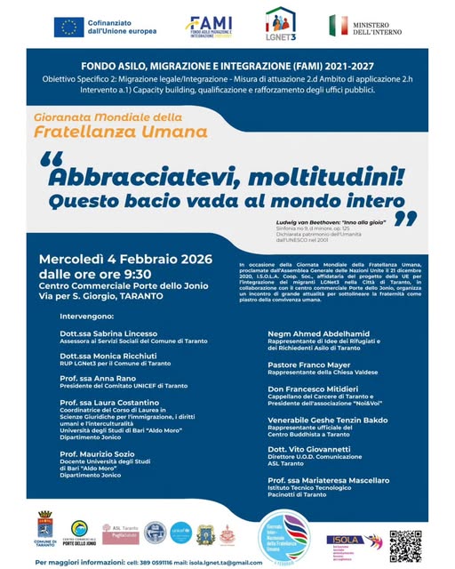 Mercoledì 4 febbraio, Giornata Mondiale della Fratellanza Umana, I.S.O.L.A. – Inclusione Sociale Orientamento Lavoro e Accoglienza Cooperativa Sociale, ente gestore locale del progetto LGNet3 per il Comune di Taranto, organizza una Tavola Rotonda dedicata ai temi dell’inclusione, della convivenza e della coesione sociale.