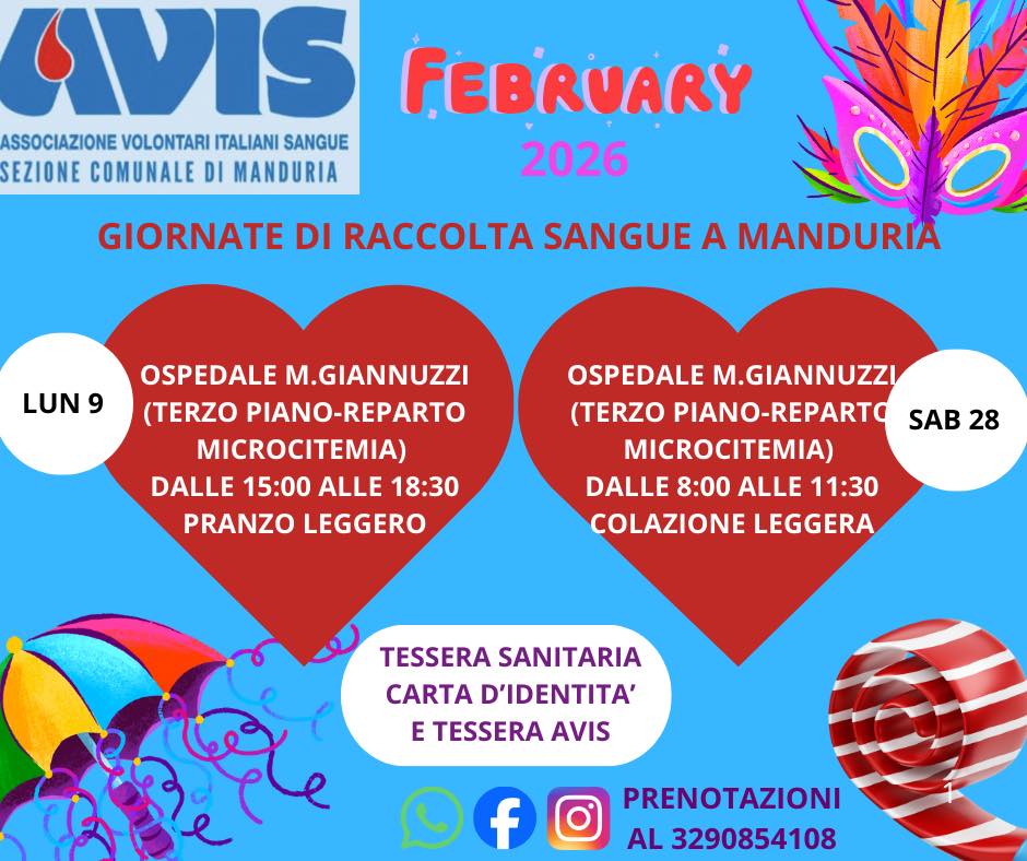 Tornano a febbraio le giornate dedicate alla raccolta straordinaria di sangue organizzate dalla Avis comunale di Manduria ODV presso l’Ospedale M. Giannuzzi (Terzo piano – Microcitemia).