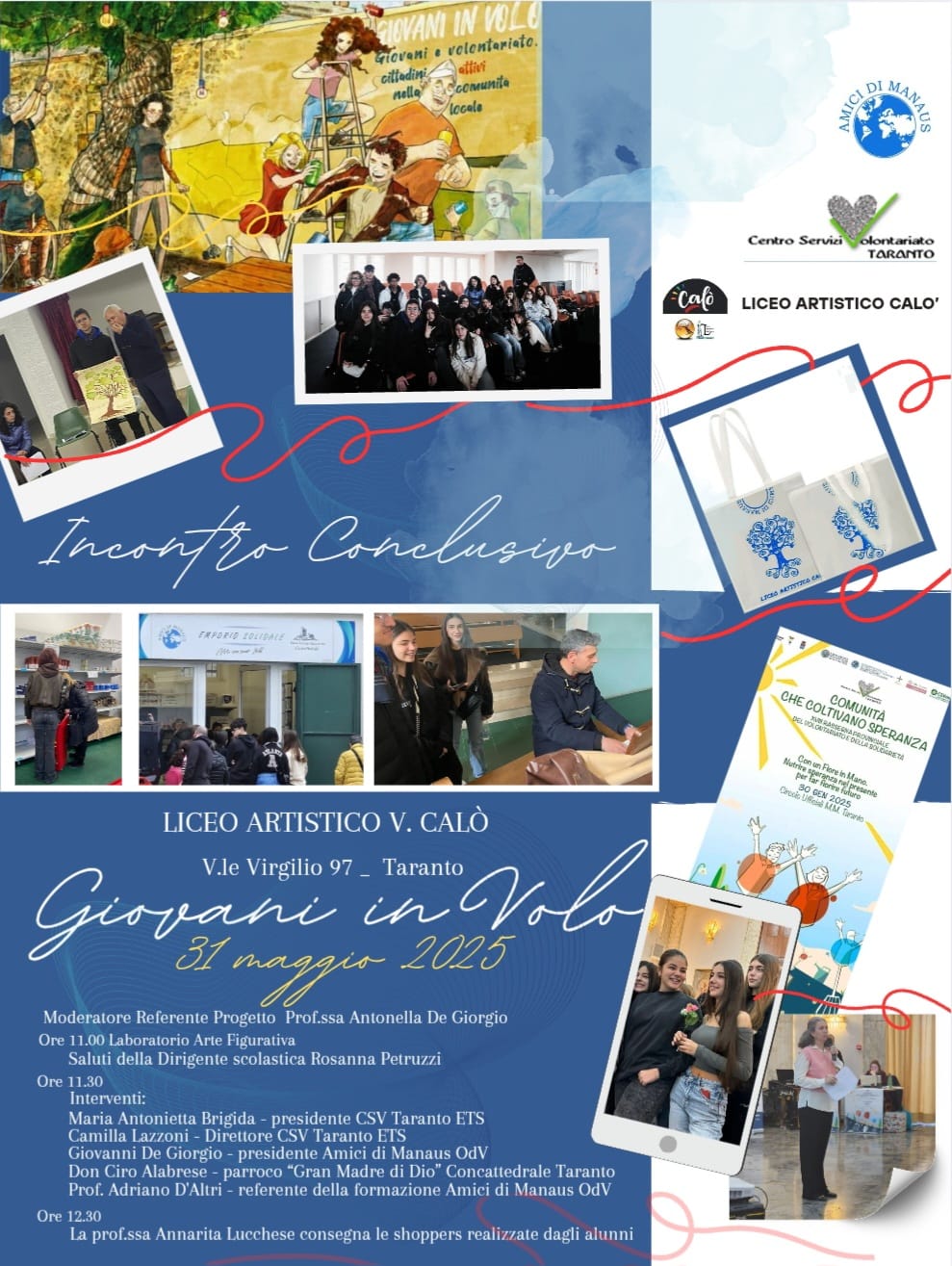 Si terrà nella mattinata del 31 maggio prossimo, presso la sede di Taranto del Liceo Artistico “V. Calò”, in V.le Virgilio 97, l’incontro conclusivo del percorso “I giovani insieme per una campagna a sostegno dei più fragili” a cura di Amici di Manaus ODV, realizzato nel corso dell’anno scolastico 2024-2025 dagli studenti e dalle studentesse della II I e II L dello stesso Liceo nell’ambito del progetto di promozione del volontariato Giovani in Volo.