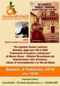 Sabato 3 febbraio, alle 19:00, presso la sede dell’ Associazione “AccordiAbili” in via Santa Margherita, s.n. a Fasano sarà presentato il libro dal titolo Ho sognato Robert Johnson – Brindisi: dagli anni ’50 ai 2000 – Frammenti di musica e resistenza di Marco Greco. Interverranno oltre all’autore, i Blues di Contrabbando e la Via del Blues.