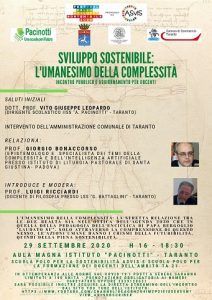 - martedì 29 settembre giorno in cui sarà ospite a Taranto il Prof. Giorgio Bonaccorso, benedettino della’Abbazia di Santa Giustina in Padova, illustre epistemologo e noto specialista dei temi della complessità e dell’intelligenza artificiale con esiti anche teologici. Alle ore 10:00 presso l’Istituto Pacinotti, è previsto un incontro aperto a tutti i soci e ai frequentatori degli incontri del Centro di Cultura. Nel pomeriggio, alle ore 16:00 nell’Aula Magna dello stesso istituto il prof. Bonaccorso terrà la sua lectio sul tema L’Umanesimo della complessità. Introdurrà e modererà il prof. Luigi Ricciardi.