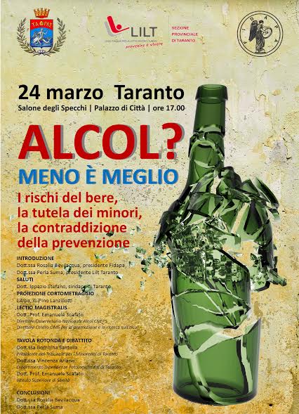 Il punto di vista più scomodo su un tema sin troppo sottovalutato. È quanto si propongono di affrontare le sezioni tarantine di Lilt e Fidapa nel convegno intitolato Alcol? Meno è meglio – I rischi del bere, la tutela dei minori, la contraddizione della prevenzione, che si terrà martedì 24 marzo alle ore 17.00, presso il Salone degli Specchi di Palazzo di Città a Taranto.