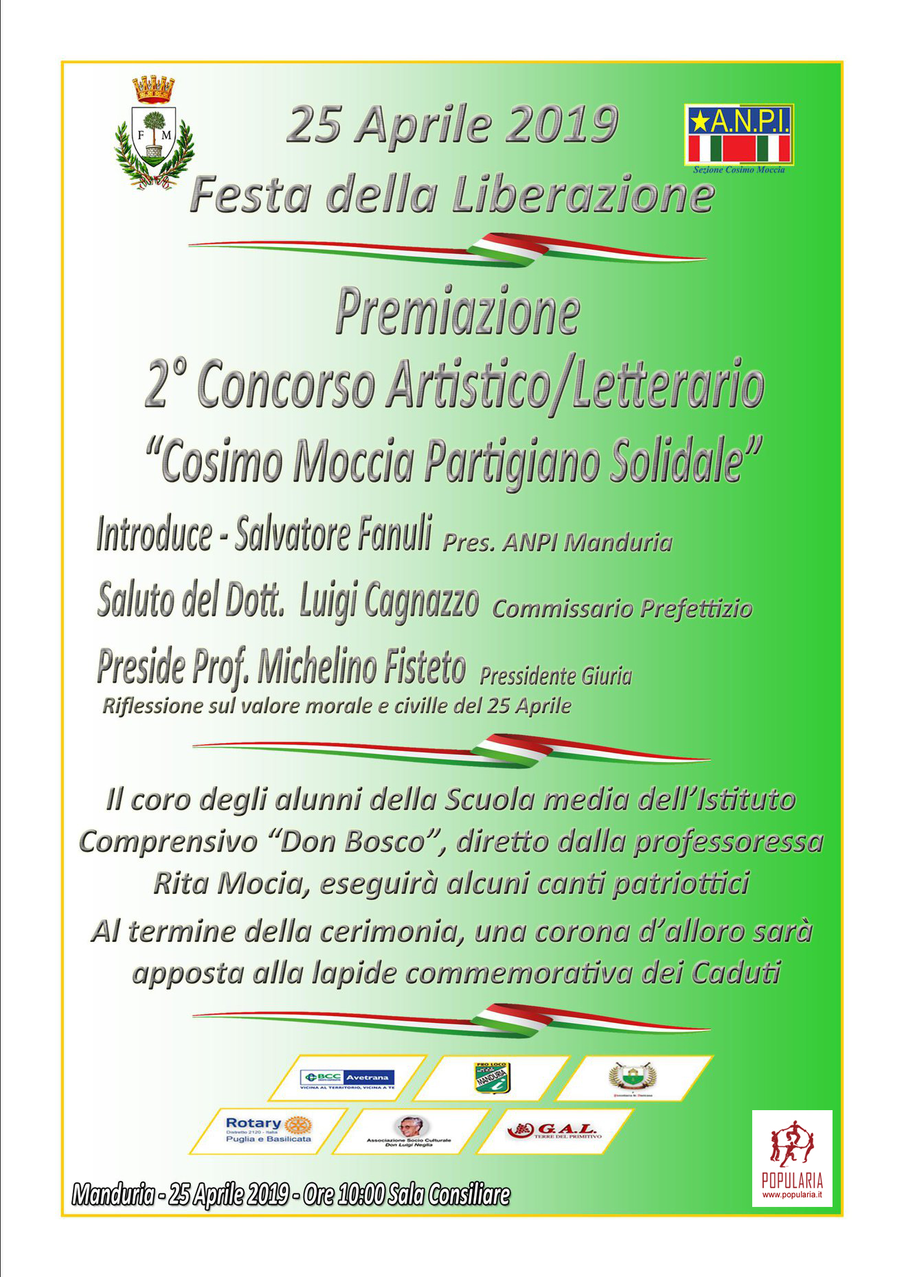 Mercoledì 25 aprile l’ANPI di Manduria, sez. Cosimo Moccia, organizza la premiazione della II edizione del Concorso Scolastico “Cosimo Moccia – partigiano solidale”.