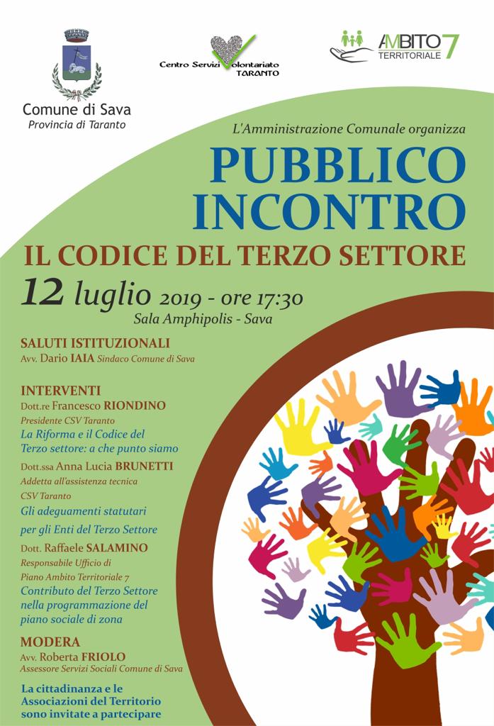 Alla luce della riforma del terzo settore l’Amministrazione Comunale di Sava in collaborazione con il CSV di Taranto e l’Ambito Territoriale 7 ha organizzato un incontro pubblico sul tema “IL CODICE DEL TERZO SETTORE” che si terrà venerdì 12 luglio ore 17.30 Sala Amphipolis.