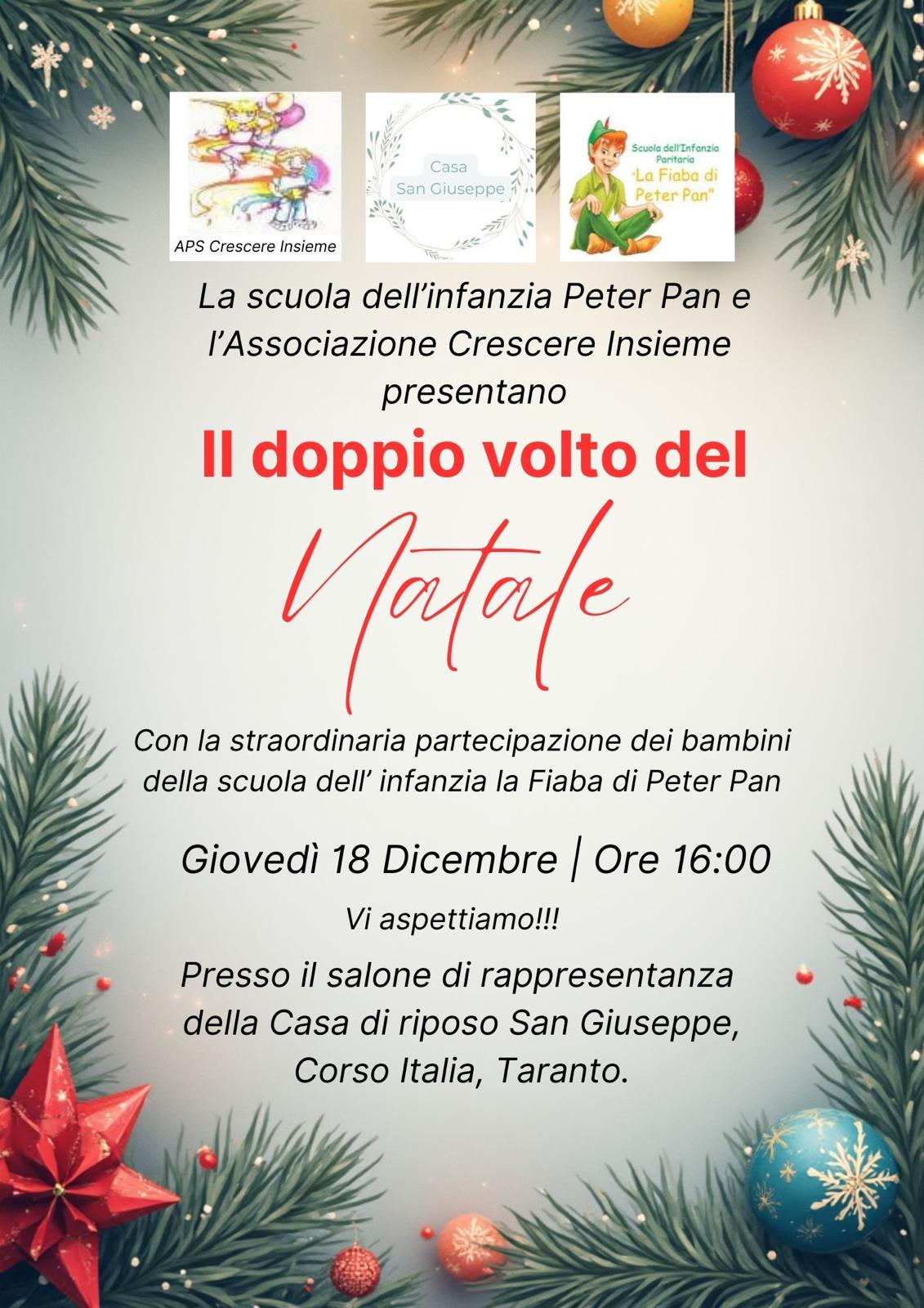 La scuola dell’ infanzia La Fiaba di Peter Pan in collaborazione con l’Associazione Crescere Insieme APS organizza nella giornata di giovedì 18 dicembre alle 16:00 presso il salone di rappresentanza della Casa di Riposo San Giuseppe in Corso Italia a Taranto, la rappresentazione dal titolo Il doppio volto del Natale.