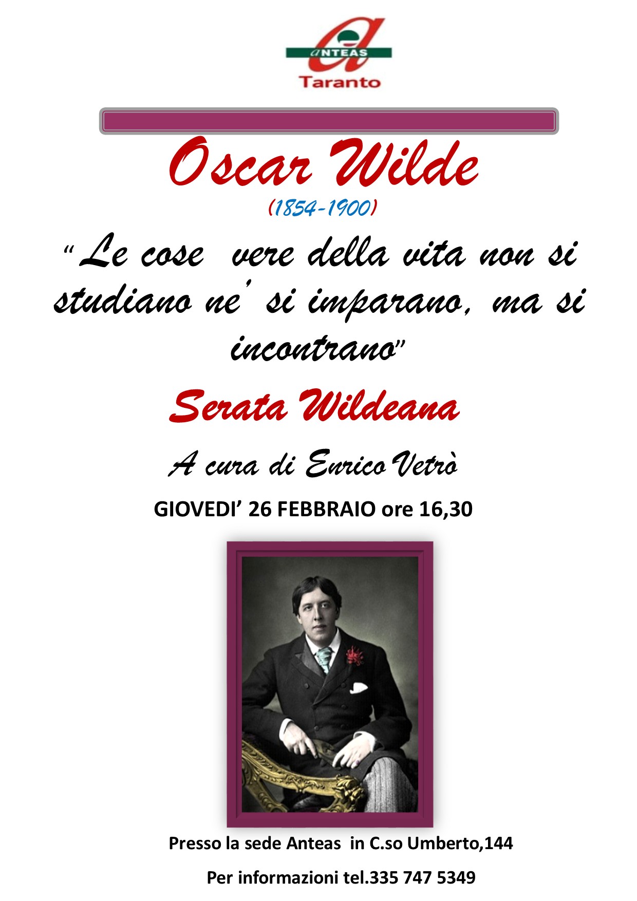 Ironico, geniale, scandaloso e fragile, Oscar Wilde sarà illustrato in tutta la sua geniale produzione artistica dal Prof. Enrico Vetrò nel corso dell’incontro organizzato dall’A.N.T.E.A.S. – ASSOCIAZIONE NAZIONALE TUTTE LE ETA’ ATTIVE PER LA SOLIDARIETA’ TARANTO APS, che si terrà giovedì 26 febbraio alle ore 16,30 presso la sede associativa in C.so Umberto 144.