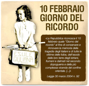 Il 10 febbraio si celebra il Giorno del Ricordo, solennità civile nazionale italiana. Istituita con la legge 30 marzo 2004 n. 92, commemora le vittime dei massacri delle foibe e dell’esodo giuliano-dalmata.