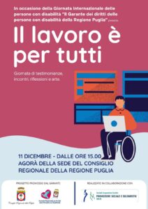 In occasione della Giornata Internazionale delle persone con disabilità, giovedì 11 dicembre a partire dalle 15:00 nell’Agorà della sede del Consiglio Regionale della Regione Puglia, si terrà un incontro promosso dal Garante Regionale dei Diritti delle Persone con Disabilità e realizzato in collaborazione con la Società Coopertaiva Sociale “Promozione Sociale e Solidarietà” Onlus.