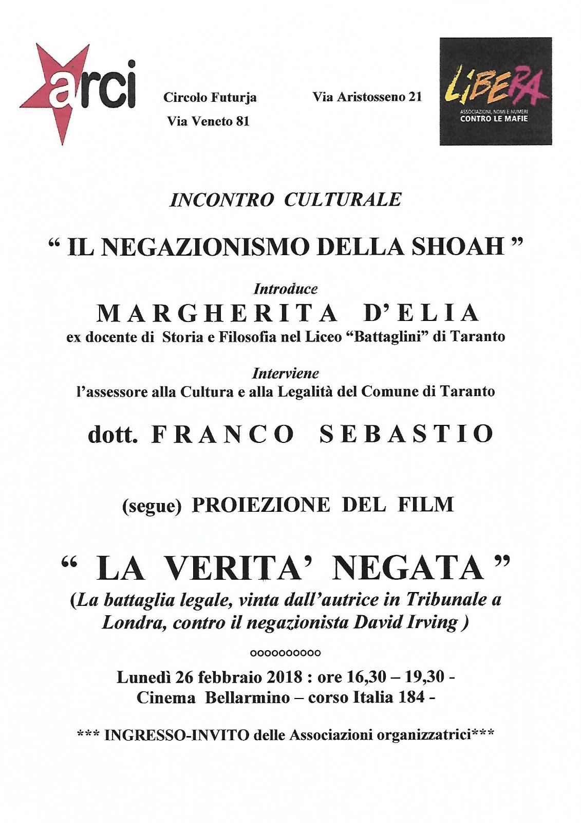 Si terrà lunedì 26 febbraio dalle ore 16:30 alle 19:30 presso il cinema Bellarmino di Taranto in C.so Italia n. 184, l’incontro culturale dal titolo Il Negazionismo della Shoah organizzato dall’Associazione Libera Taranto in collaborazione con il Circolo Arci Futurja.