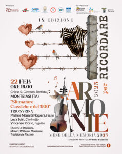 L’edizione 2025 di ArmoniE per Ricordare, è promossa dall’Associazione ArmoniE OdV, con la direzione artistica del M° Palma di Gaetano e patrocinata dalla Provincia di Taranto e dalla Regione Puglia – Assessorato Cultura, Tutela e Sviluppo delle Imprese Culturali, Politiche Migratorie, Legalità e Antimafia Sociale.
