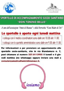Questo è lo spirito con cui è nato a Taranto lo Sportello di accompagnamento sanitario “Don Tonino Bello”, la nuova iniziativa di servizio realizzata dell’Associazione “Amici Manaus” Onlus in collaborazione con la Concattedrale “Gran Madre di Dio”. Lo Sportello, il cui coordinatore medico è il Dottor Francesco Zito, è aperto ogni lunedì, dalle ore 10.00 alle ore 11.00, in un locale della Parrocchia della Concattedrale in via Blandamura, 7.