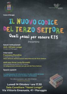 L’Amministrazione Comunale di Maruggio e il C.S.V. di Taranto organizza un incontro sul tema “IL CODICE DEL TERZO SETTORE – QUALI PASSI PER ESSERE ETS” che si terrà lunedì 14 ottobre alle ore 17.30 presso la Sala Consiliare “Vanni Longo” in via Vittorio Emanuele, 41 a Maruggio.