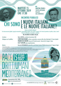 Questo pomeriggio, martedì 15 ottobre alle ore 17:30 presso la sede dell’Associazione Artigiana di Mutuo Soccorso – Palazzo dell’Università in Piazza Plebiscito, 20 tornano gli incontri pubblici proposti dall’Associazione SUD, nell’ambito dell’iniziativa internazionale, Pace Diritti Umani Mediterraneo – PaDUMe. La programmazione per il biennio 2019-2020 si sviluppa attorno alla domanda: Chi sono i nuovi italiani e le nuove italiane?”