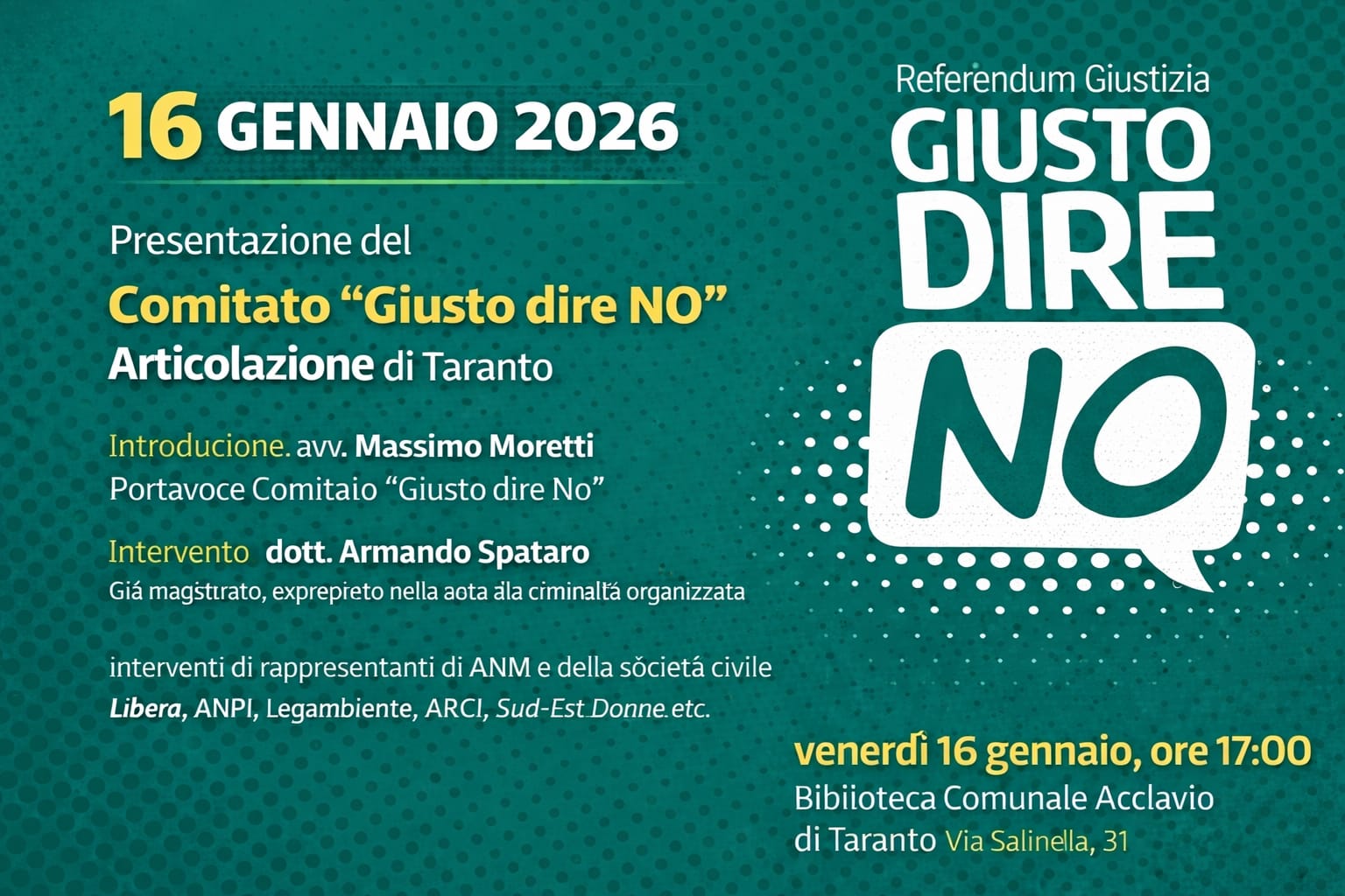 Venerdì 16 gennaio alle ore 17:00 presso la Biblioteca Comunale P. Acclavio di Taranto in via Salinella 31, si terrà l’incontro pubblico di presentazione del Comitato “Giusto dire No” – Articolazione di Taranto, impegnato nella campagna per il No al referendum sulla giustizia.