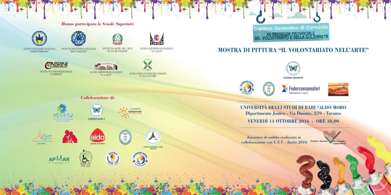 L’incontro tra volontariato e scuola è avvenuto grazie al progetto Il volontariato nell’arte, promosso da una rete di associazioni di volontariato composta dall’Associazione “Marco Motolese”, Federconsumatori, Nomedia, Movimento Shalom e Solirunners e sostenuto dal Centro Servizi Volontariato di Taranto nell’ambito dell’Invito 2016 – Proposte in collaborazione con il CSV. Il progetto mira a divulgare e promuovere il volontariato nel mondo della scuola attraverso il linguaggio dell’arte.