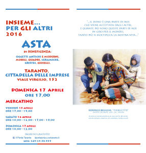 Quest’anno l’asta “Insieme… per gli altri” si terrà nell’agorà della Cittadella delle Imprese della Camera di Commercio di Taranto, in viale Virgilio, 152 dalle ore 17:00 di domenica 17 aprile, e sarà preceduta da un “mercatino” con la vendita diretta di piccoli oggetti nelle giornate di: