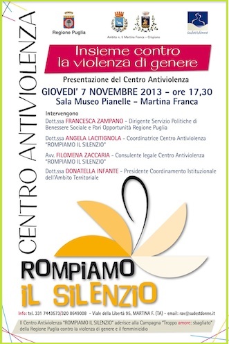 Giovedì 7 novembre p.v., alle ore 17:30 presso la Sala Museo delle Pianelle di Martina Franca si terrà l’incontro pubblico dal titolo Insieme contro la violenza di genere, ed è in questa occasione che l’Associazione Sud Est Donne in coerenza con l’ attività da sempre svolta contro la violenza di genere, presenterà il Centro Antiviolenza Rompiamo il silenzio.