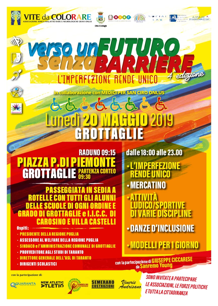 Lunedì 20 maggio p.v. si terrà a Grottaglie la IV^ edizione di VERSO UN FUTURO SENZA BARRIERE, manifestazione a favore dello sviluppo della sensibilità e cultura di base per la disabilità, l’eliminazione delle barriere culturali ed architettoniche e l’incremento del senso civico, organizzata dall’Associazione “Vite da Colorare – Associazione jonica malattie rare e neurologiche gravi onlus”.