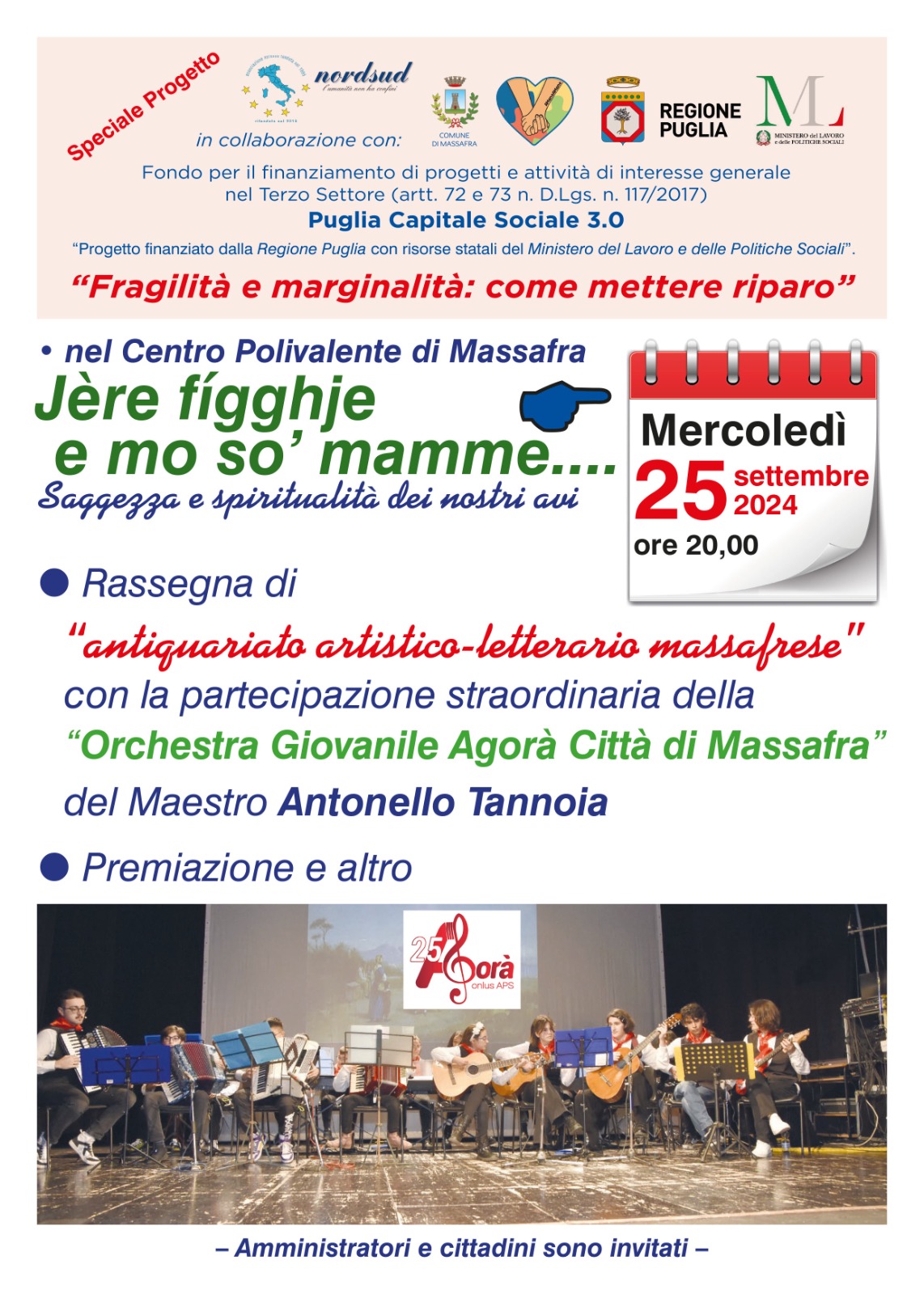 Si terrà mercoledì 25 settembre alle ore 20:00 presso il Centro Polivalente di Massafra l’iniziativa Jère fìgghje e mo so’ mamme…,rassegna di antiquariato artistco-letterario massafrese che vedrà la partecipazione dell’Orchestra giovanile Agorà Città di Massafra del M. Antonello Tannoia a cura dell’Associazione Nord Sud ETS – APS.