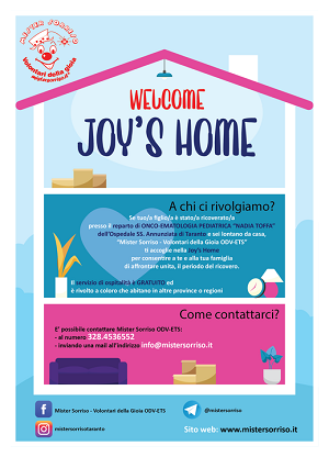 Si chiama Joy’s Home il nuovo servizio di ospitalità GRATUITO offerto dall’Associazione “Mister Sorriso – Volontari della Gioia” dedicato a quelle famiglie, provenienti da altre province o regioni, che per seguire e stare accanto ai propri figli ricoverati presso il reparto di ONCO-EMATOLOGIA PEDIATRICA “NADIA TOFFA” dell’Ospedale SS. Annunziata di Taranto devono affrontare il periodo di ricovero lontano da casa.