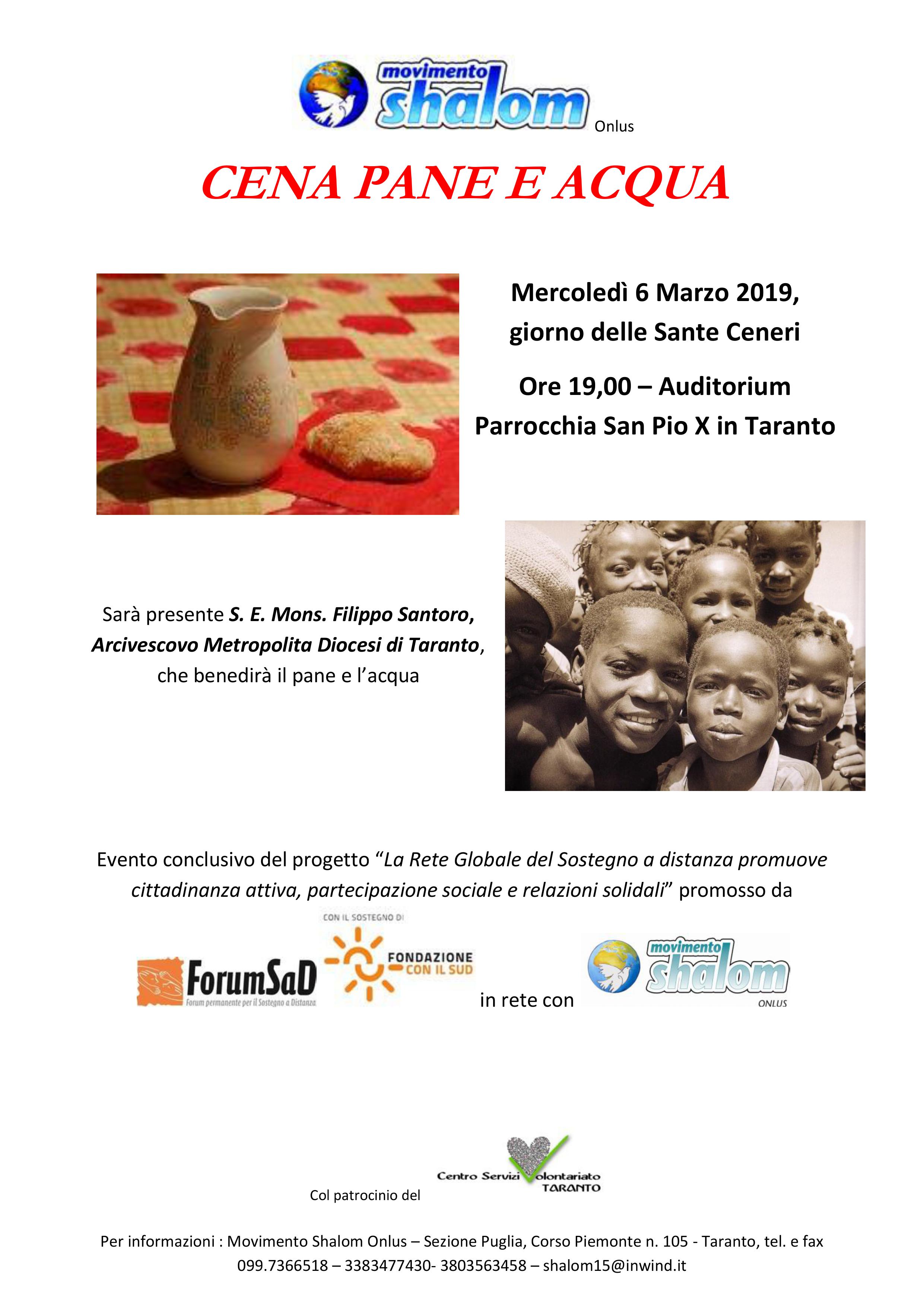 Mercoledì 6 marzo, nel giorno delle Sante Ceneri, il Movimento Shalom Onlus – Sezione Puglia invita soci, associazioni e cittadinanza, al di là del credo religioso, ad unirsi insieme per la consueta iniziativa quaresimale della CENA A PANE E ACQUA che si terrà alle ore 19.00 nell’Auditorium San Pio X in piazza S. Pio X in Taranto, dopo la S. Messa.