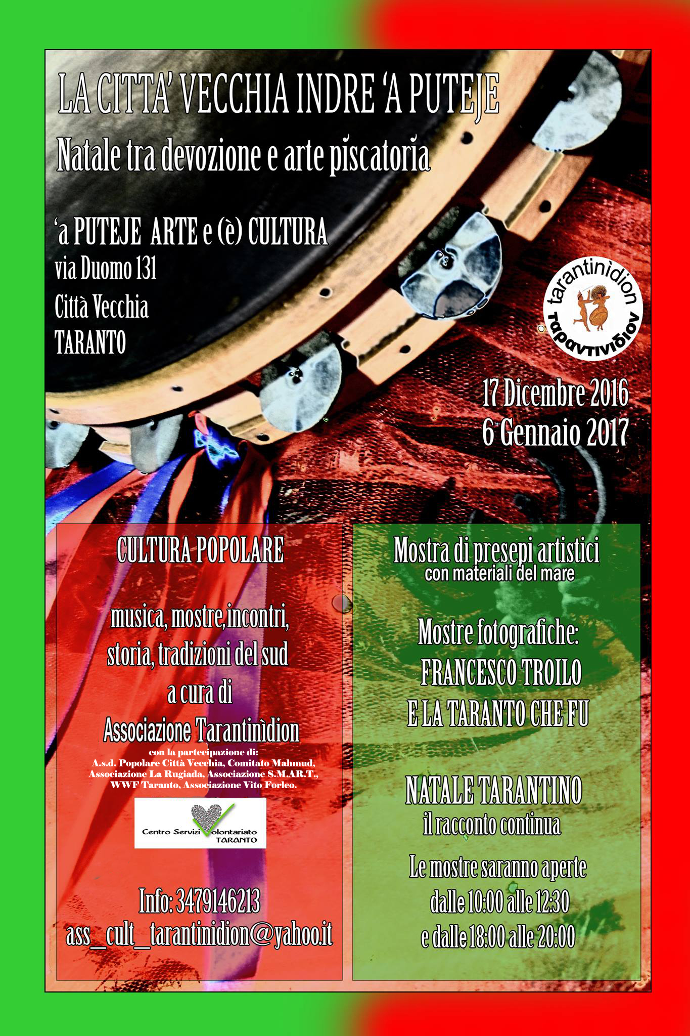 Torna La Città Vecchia indre ‘a Puteje: Natale tra devozione e arte piscatoria, un momento di animazione culturale incentrato sulle tradizioni tarantine e sulla storia della città vecchia, giunto alla sua IV Edizione. Promossa dall‘Associazione Tarantinìdion insieme ad altre realtà del volontariato e del terzo settore che operano nella Città Vecchia di Taranto – WWF Taranto, l’Associazione S.M.AR.T. Maestri di strada, Comitato Mamud, La Rugiada, Associazione Vito Forleo, ASD Popolare Città Vecchia – e al progetto Domus Armenorum, l‘iniziativa, che rientra tra i Momenti partecipativi previsti dalla programmazione 2016 del C.S.V. Taranto, sarà inaugurata sabato 17 dicembre alle ore 18:30, durante la serata si potranno degustare tarallucci e vino.