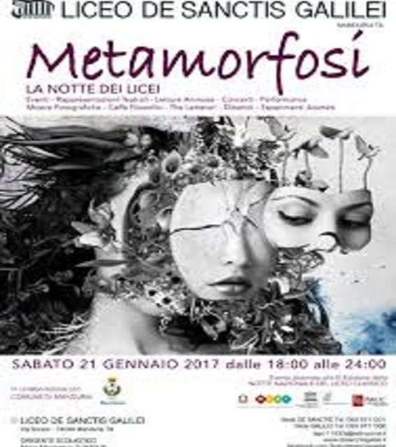 Sabato 21 gennaio p.v. dalle 18:00 alle 24:00 entrambe le sedi dell’Istituto si trasformeranno in una vera e propria fucina di idee che gli alunni esprimeranno attraverso numerose performance: rappresentazioni teatrali, musicali e danzanti, mostre fotografiche e artistiche, talk show filosofici e caffè letterari ispirati al tema de “Le Metamorfosi”.