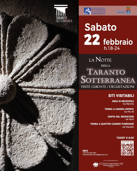 Oltre a questa apertura straordinaria il circuito archeologico della Taranto Sotterranea è fruibile il sabato dalle ore 16:00 alle 20:00 e la domenica dalle ore 09:00 alle 13:00.